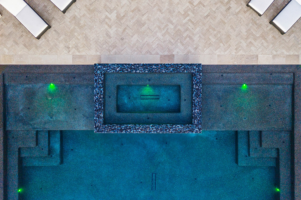 - Infinity Pool with Hot Tub: Sleek black-tiled edges, LED lighting, and mosaic detailing.