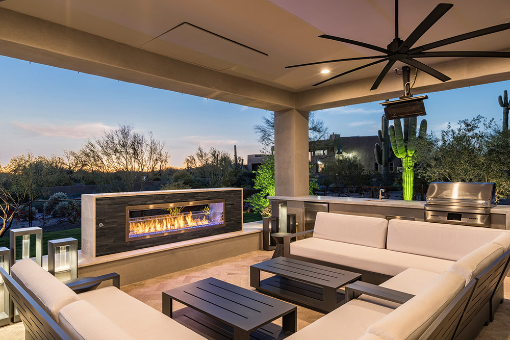 The pool is surrounded by a stylish herringbone-patterned stone deck, complemented by plush lounge chairs and modern coffee tables, ideal for relaxation and entertaining. The covered patio features a high-end outdoor kitchen with a stainless steel grill, a large ceiling fan, and built-in heaters, ensuring year-round comfort in Scottsdale’s desert climate.